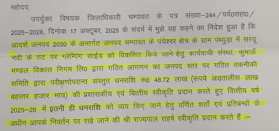 चम्पावत। मुख्यमंत्री पुष्कर सिंह धामी के नेतृत्व में ‘आदर्श जनपद 2030’ योजना के अंतर्गत चम्पावत जिले में पर्यटन विकास को सुदृढ़ करने हेतु एक महत्वपूर्ण कदम उठाते हुए पंचेश्वर क्षेत्र के ग्राम पंथ्युड़ा में सरयू नदी तट पर आधुनिक एवं लग्जरी ग्लैम्पिंग साइट विकसित करने की महत्वाकांक्षी परियोजना को शासन से औपचारिक स्वीकृति प्राप्त हो गई है।