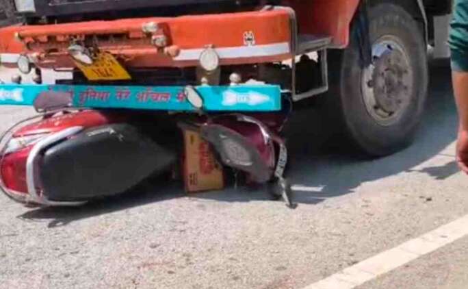 चम्पावत : एनएच पर बड़ा हादसा, कैंटर की चपेट में आई स्कूटी; हेलमेट ने बचाई महिला की जान