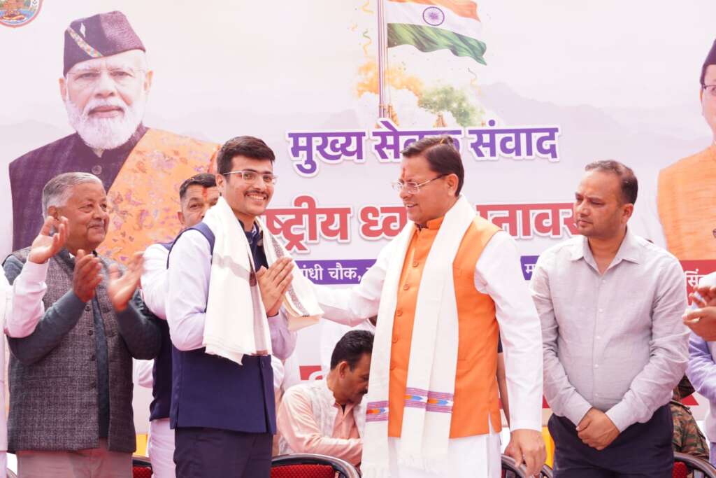 चम्पावत। गांधी चौक में आयोजित मुख्य सेवक संवाद एवं राष्ट्रीय ध्वज अनावरण कार्यक्रम के दौरान मुख्यमंत्री पुष्कर सिंह धामी ने संघ लोक सेवा आयोग (UPSC) परीक्षा में अखिल भारतीय स्तर पर 69वीं रैंक प्राप्त करने वाले जनपद के विकास खंड बाराकोट के छुलापे गांव के अनुज पंत को शॉल ओढ़ाकर सम्मानित किया।