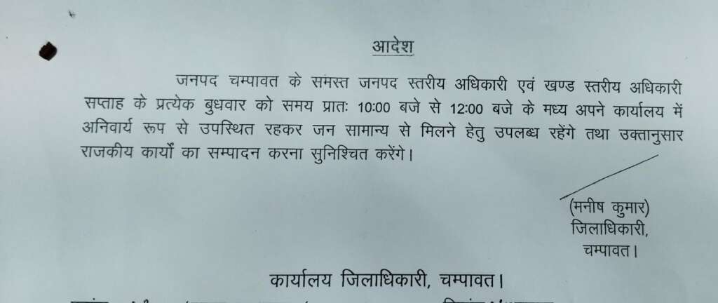 चम्पावत। जिलाधिकारी मनीष कुमार ने जनपद में जन सुनवाई प्रक्रिया को और अधिक सुव्यवस्थित तथा प्रभावी बनाने के उद्देश्य से चम्पावत के सभी जनपद स्तरीय और खंड स्तरीय अधिकारियों को कड़े निर्देश जारी किए हैं। निर्देशों के अनुसार, सभी अधिकारी सप्ताह के प्रत्येक बुधवार को प्रातः 10:00 बजे से दोपहर 12:00 बजे तक अपने कार्यालयों में अनिवार्य रूप से उपस्थित रहेंगे। इस दौरान अधिकारी जन सामान्य से मिलने हेतु उपलब्ध रहेंगे, ताकि ग्रामीण और शहरी क्षेत्रों से आने वाले लोगों की समस्याओं को सुना जा सके और उनका त्वरित निस्तारण सुनिश्चित किया जा सके।