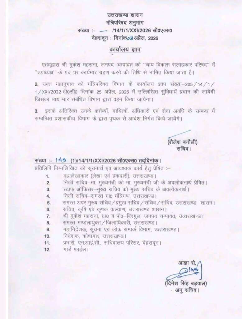 जिला पंचायत अध्यक्ष पद पर उनकी पत्नी निर्मला महराना ने भी प्रबल दावेदार की थी, लेकिन बीजेपी आला कमान से टिकट आनंद अधिकारी को मिलने के बाद उन्होंने कदम पीछे खींच लिए थे। 2027 विधानसभा चुनाव से पहले मुख्यमंत्री पुष्कर धामी ने युवा नेता को दायित्वधारी बना कर मास्टर स्ट्रोक खेला है। मुकेश महराना को चाय विकास बोर्ड का उपाध्यक्ष बनाए जाने पर भाजपा कार्यकर्ताओं में खुशी की लहर है। मुकेश महाराना को चाय विकास सलाहकार परिषद में उपाध्यक्ष पद पर मनोनीत किए जाने संबंधी पत्र सचिव शैलेश बगौली ने पत्र जारी किया है। मालूम हो कि इससे पहले चम्पावत के वरिष्ठ भाजपा नेता श्याम नारायण पांडेय को भी दायित्वधारी बनाया गया है।