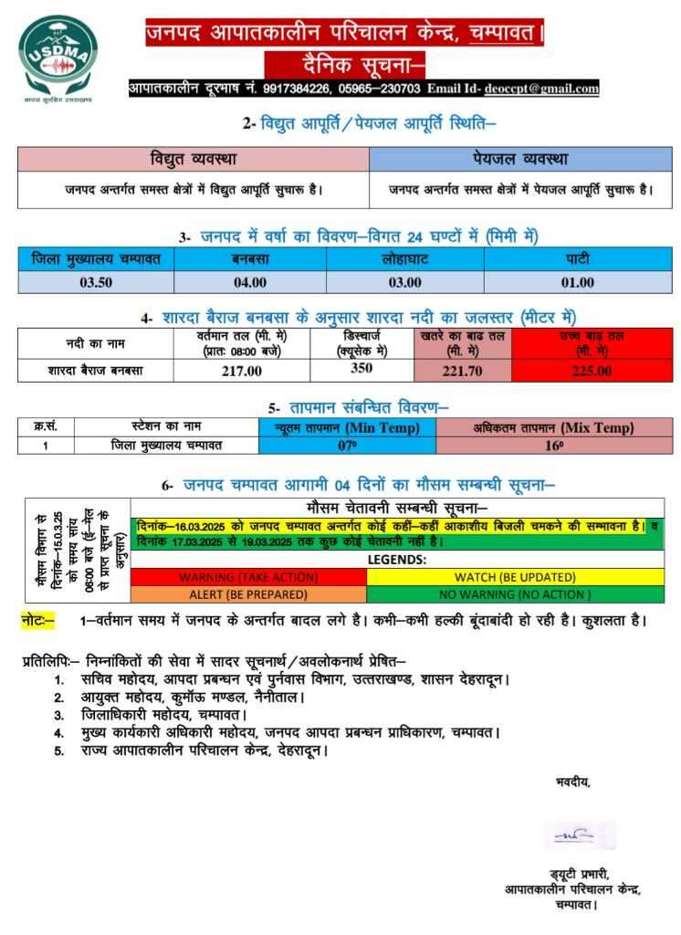 बीती रात और आज 16 मार्च की सुबह जिले के विभिन्न हिस्सों में बारिश हुई आपदा परिचालन केंद्र के मुताबिक चम्पावत जिले के अधिकांश पहाड़ी हिस्सों में बारिश से तापमान में गिरावट हुई। पिछले 24 घंटों में चम्पावत में 3.50, लोहाघाट में 3, पाटी में 1 और बनबसा में 4 मिमी बारिश दर्ज हुई। चम्पावत का न्यूनतम तापमान 7 डिग्री और अधिकतम 16 डिग्री सेल्सियस रहा। वहीं माना जा रहा है कि कल 17 मार्च से मौसम सामान्य हो जाएगा।