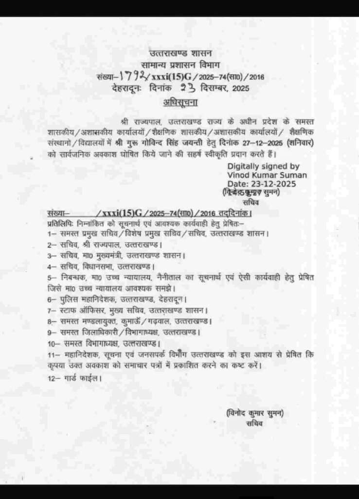 उत्तराखंड में 27 दिसंबर को सार्वजनिक अवकाश घोषित