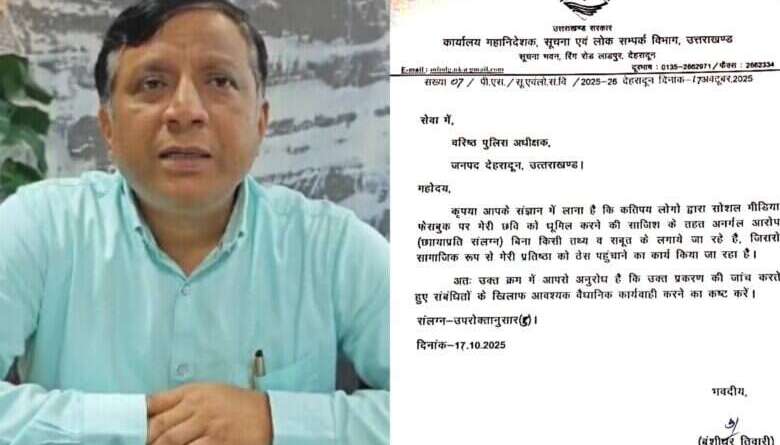 दरअसल, देहरादून एसएसपी अजय सिंह भेजे शिकायती पत्र में उत्तराखंड डीजी सूचना बंशीधर तिवारी ने कहा है कि ‘कुछ लोगों की ओर से सोशल मीडिया पर मेरी छवि को धूमिल करने की साजिश के तहत बिना किसी तथ्य के आरोप लगाए जा रहे हैं. जिससे मेरी सामाजिक प्रतिष्ठा को ठेस पहुंच रही है।’ उन्होंने इस मामले में दोषियों की पहचान कर कार्रवाई करने का अनुरोध किया है।