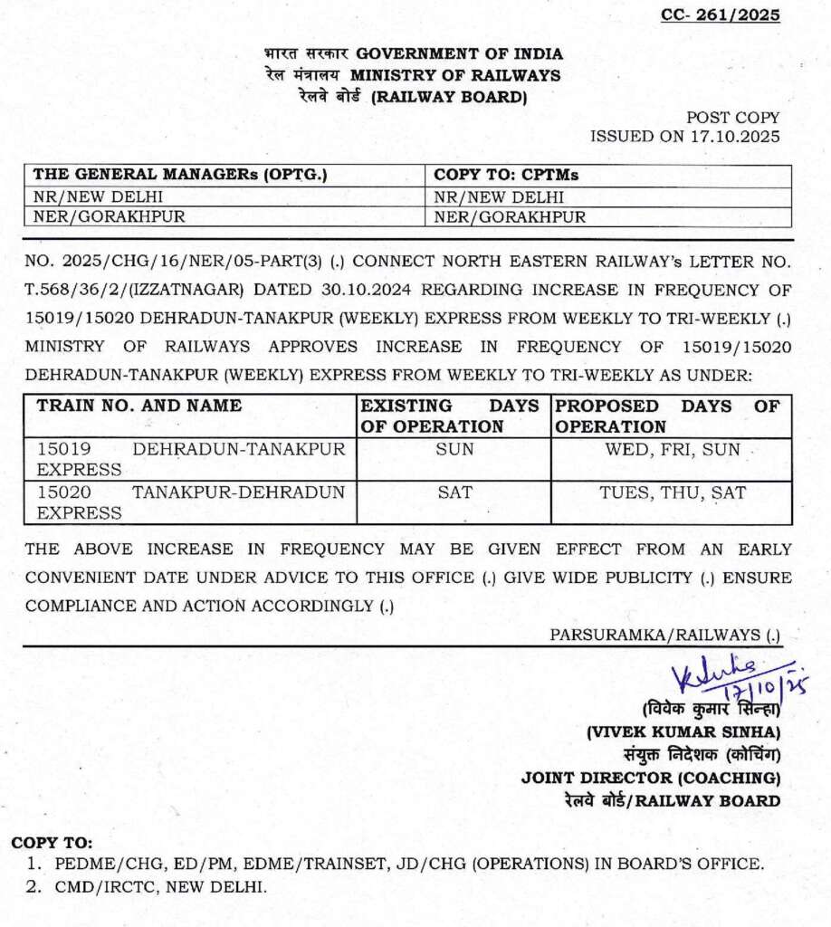 टनकपुर/चम्पावत/देहरादून। उत्तराखंड के रेल यात्रियों के लिए राहत भरी खबर है। रेल मंत्रालय भारत सरकार ने देहरादून–टनकपुर एक्सप्रेस (15019/15020) की सेवा आवृत्ति को साप्ताहिक से बढ़ाकर त्रि-साप्ताहिक (तीन दिन) करने की स्वीकृति प्रदान कर दी है। इस संबंध में रेल मंत्रालय ने आदेश जारी कर दिया है |