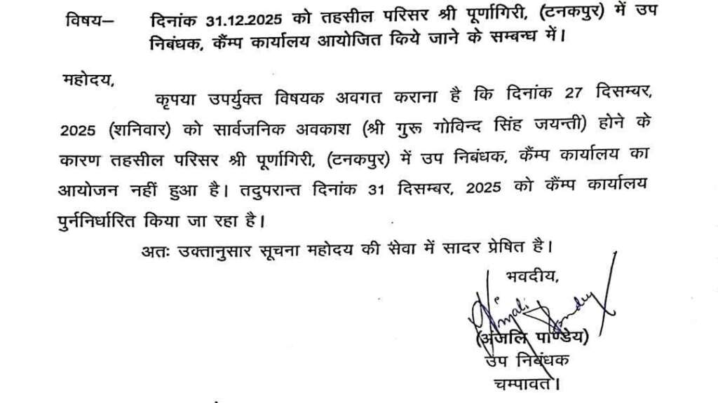 चम्पावत। उप निबंधक अंजली पांडेय ने जानकारी देते हुए बताया कि तहसील परिसर श्री पूर्णागिरी (टनकपुर) में प्रस्तावित उप निबंधक कैम्प कार्यालय के आयोजन की तिथि में परिवर्तन किया गया है। उन्होंने अवगत कराया कि दिनांक 27 दिसम्बर, 2025 (शनिवार) को श्री गुरु गोविन्द सिंह जयंती के अवसर पर सार्वजनिक अवकाश घोषित होने के कारण उक्त तिथि को उप निबंधक कैम्प कार्यालय का आयोजन नहीं हो सका।
