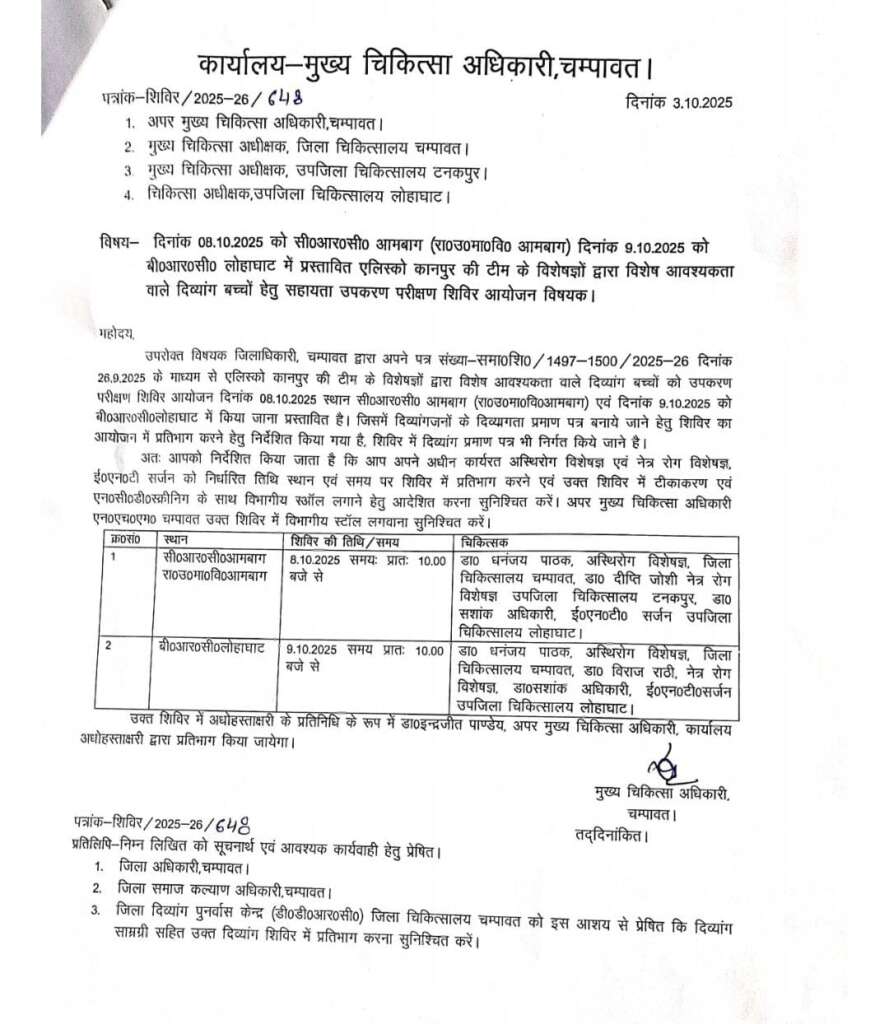 यह शिविर दो स्थानों पर आयोजित किया जाएगा। पहला शिविर 08 अक्टूबर 2025 को सी.आर.सी. आमबाग (रा.उ.मा.वि. आमबाग) में और दूसरा 09 अक्टूबर 2025 को बी.आर.सी. लोहाघाट में प्रातः 10 बजे से शुरू होगा। डॉ. चौहान ने बताया कि इस शिविर में केवल सहायता उपकरण और प्रमाण पत्र नहीं बल्कि टीकाकरण और एनसीडी (गैर-संचारी रोग) स्क्रीनिंग की सुविधाएँ भी उपलब्ध होंगी। विभागीय स्टॉल लगाए जाएंगे ताकि अधिक से अधिक बच्चों और उनके परिवारों को स्वास्थ्य संबंधी लाभ मिल सके। यह आयोजन दिव्यांग बच्चों और उनके परिवारों के लिए बड़ी राहत साबित होगा।