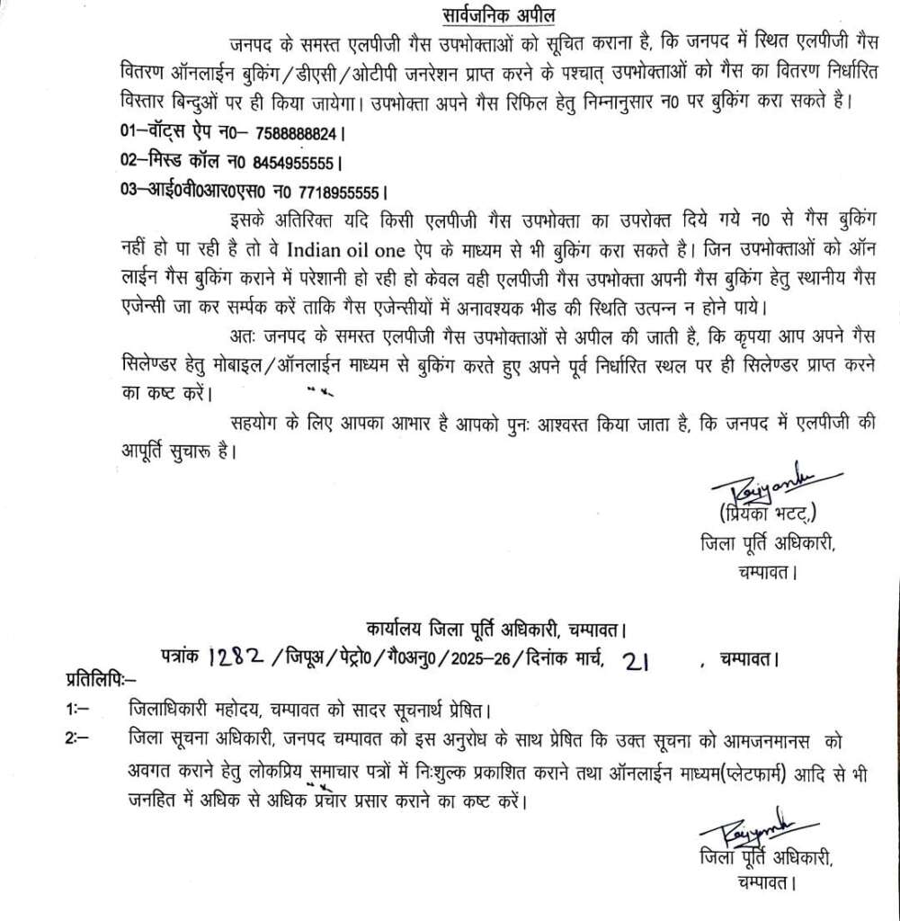 चम्पावत। जिला पूर्ति अधिकारी प्रियंका भट्ट द्वारा जनपद के समस्त एलपीजी गैस उपभोक्ताओं को सूचित किया गया है कि जनपद में गैस वितरण व्यवस्था को सुव्यवस्थित एवं पारदर्शी बनाने हेतु एलपीजी सिलेंडर का वितरण केवल ऑनलाइन बुकिंग/डीएसी/ओटीपी जनरेशन के उपरांत निर्धारित वितरण बिंदुओं पर ही किया जाएगा।