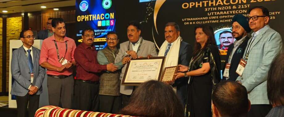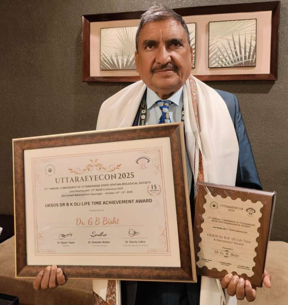 चम्पावत/रामनगर। चम्पावत के मूल निवासी और वर्तमान में हल्द्वानी रह रहे नामी नेत्र रोग विशेषज्ञ डॉ. जीबी बिष्ट को उल्लेखनीय सेवाओं के लिए वर्ष 2025 के UKSOS (Uttarakhand State Ophthalmological Society) डॉ. बीके ओली Life Time Achievement Award से नवाजा गया है। उन्हें यह सम्मान रामनगर में दिया गया। डॉ. राजेश तिवारी, डॉ. गौरव लूथरा, डॉ. शतांशु माथुर ने इस सम्मान से नवाजा।