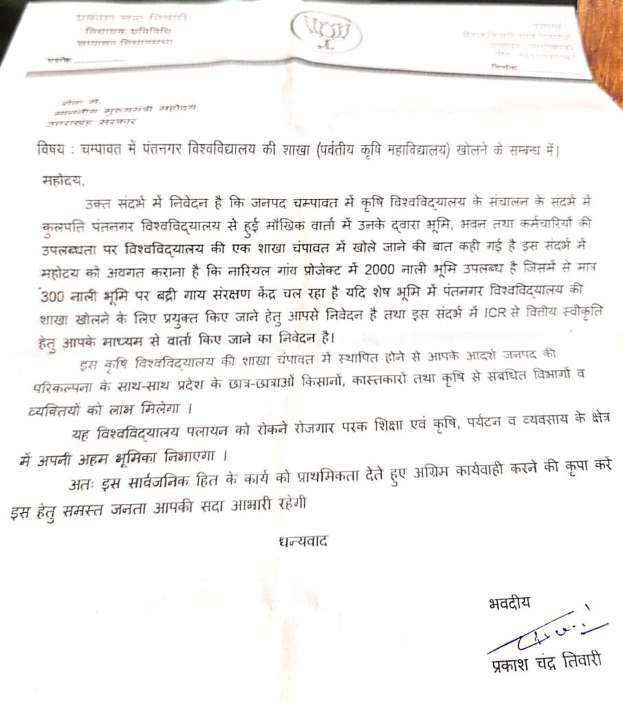 ज्ञापन में तिवारी ने चम्पावत जिले में पंतनगर विवि की शाखा पर्वतीय कृषि महाविद्यालय खोलने की मांग की थी। उन्होंने चम्पावत से करीब 20 किमी दूर नारियलगांव क्षेत्र में कृषि महाविद्यालय खोलने के औचित्य और भौतिक संसाधनों की उपलब्धता का भी उल्लेख किया था। नरियालगांव प्रोजेक्ट की 2 हजार नाली जमीन में से सिर्फ 300 नाली भूमि पर वर्तमान में बद्री गाय संरक्षण केंद्र चलने का उल्लेख किया था। ऐसे में शेष 1700 नाली भूमि का उपयोग पंतनगर विश्वविद्यालय की शाखा के रूप में कृषि महाविद्यालय खोलने के लिए किया जा सकता है। ज्ञापन में कहा गया था कि कृषि महाविद्यालय चम्पावत में स्थापित होने से आदर्श जिले की परिकल्पना के साथ प्रदेश के छात्रों, किसानों, कास्तकारों और कृषि से संबंधित विभागों व व्यक्तियों को लाभ मिलेगा और पलायन को रोकने में भी मदद मिलेगी।