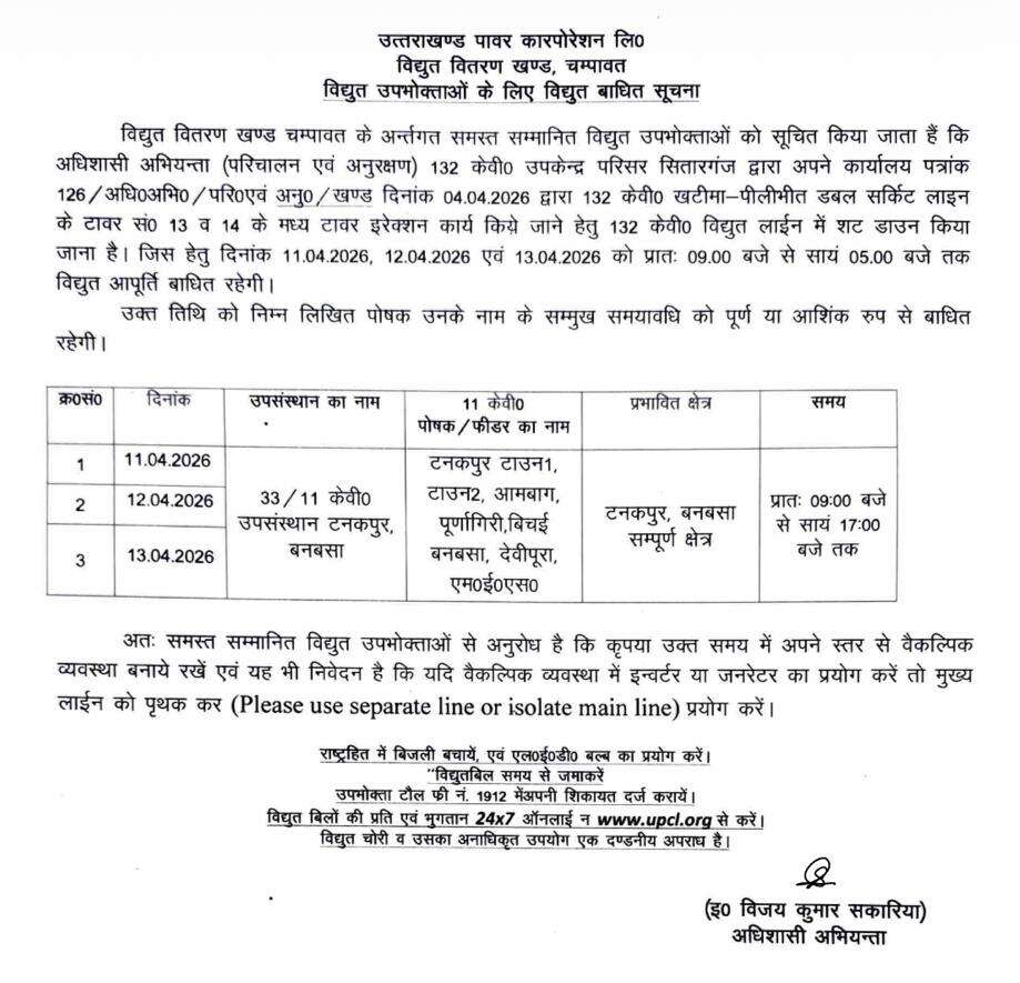 टनकपुर/चम्पावत। यूपीसीएल विद्युत वितरण खंड चम्पावत की ओर से सूचना के अनुसार टनकपुर क्षेत्र में लाइन अनुरक्षण एवं आवश्यक कार्यों के चलते 11 अप्रैल से 13 अप्रैल 2026 तक तीन दिनों तक बिजली आपूर्ति अस्थायी रूप से बाधित रहेगी।