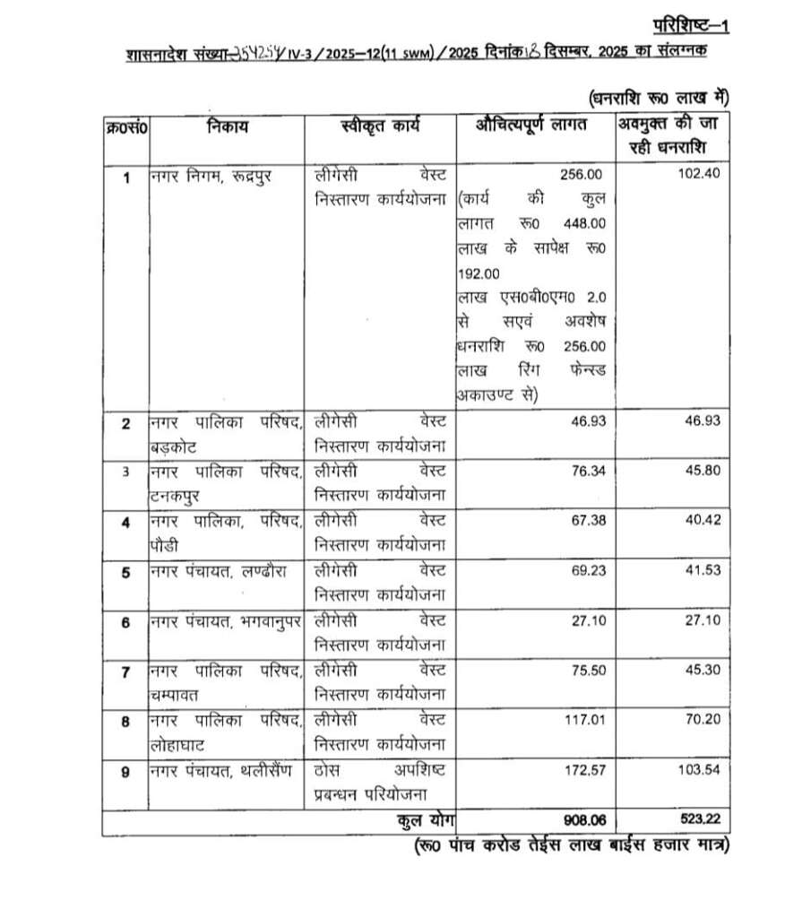 राष्ट्रीय हरित अधिकरण (एनजीटी) के निर्देशों के अनुपालन में शहरी विकास विभाग ने जनपद की नगरपालिकाओं में लीगेसी वेस्ट निस्तारण के लिए प्रथम चरण में धनराशि स्वीकृत की है। इसके अंतर्गत जनपद की तीन नगरपालिका परिषदों में कूड़ा निस्तारण कार्य को गति देने के उद्देश्य से कुल ₹268.85 लाख की परियोजना स्वीकृत की गई है। नगरपालिका परिषद लोहाघाट के लिए कुल स्वीकृत ₹117.01 लाख के सापेक्ष प्रथम चरण में ₹70.20 लाख, नगरपालिका परिषद चम्पावत के लिए ₹75.50 लाख के सापेक्ष ₹45.30 लाख तथा नगरपालिका परिषद टनकपुर के लिए ₹76.34 लाख के सापेक्ष प्रथम किश्त के रूप में ₹45.80 लाख की वित्तीय एवं प्रशासनिक स्वीकृति प्रदान की गई है।