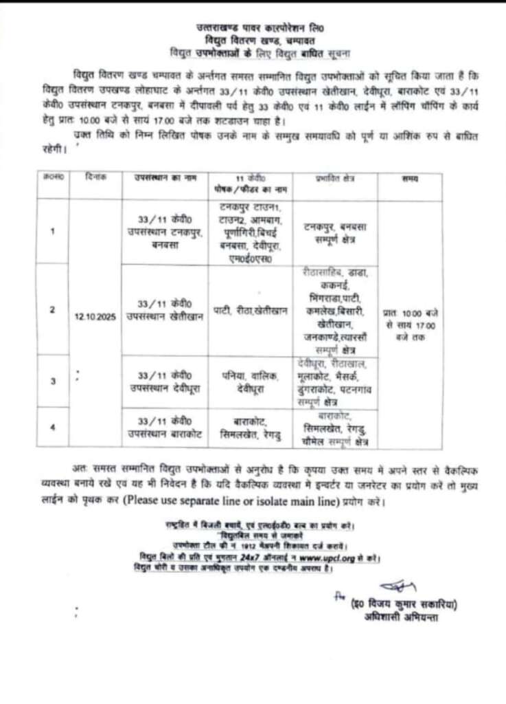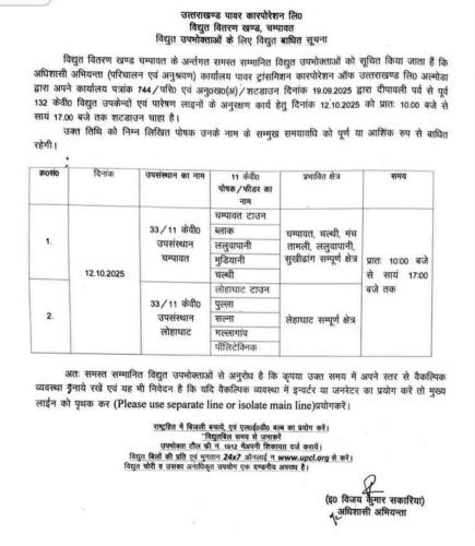 चम्पावत। विद्युत विभाग द्वारा दीपावली पर्व के मद्देनजर 132 केवी विद्युत उपकेंद्रों एवं पारेषण लाइनों की आवश्यक मरम्मत कार्य के कारण रविवार 12 अक्टूबर को सुबह 10 बजे से शाम 5 बजे तक टनकपुर, बनबसा के साथ ही लोहाघाट, चम्पावत, खेतीखान, पाटी व रीठा क्षेत्रों में विद्युत आपूर्ति पूर्ण व आंशिक रूप से बाधित रहेगी। विभाग ने कहा है कि यह मरम्मत कार्य क्षेत्र में विद्युत आपूर्ति की सुरक्षा एवं गुणवत्ता सुनिश्चित करने के लिए अत्यंत आवश्यक है। विभाग ने उपभोक्ताओं से अपील की है कि वे कटौती के दौरान अपनी ओर से वैकल्पिक व्यवस्था करें और मरम्मत कार्य में सहयोग प्रदान करें। विद्युत विभाग की यह पहल उपभोक्ताओं को बेहतर और सुनिश्चित विद्युत सेवा प्रदान करने के लिए की जा रही है। उपभोक्ताओं से आग्रह किया गया है कि वे इस दौरान आवश्यक सावधानियां बरतें और विभागीय निर्देशों का पालन करें।
