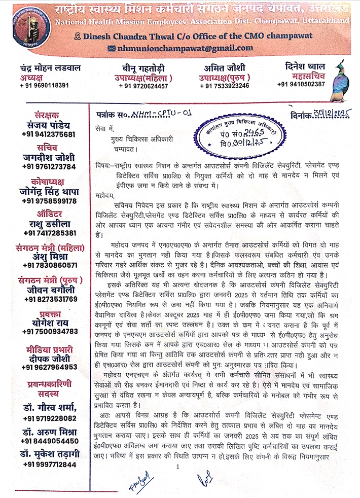संगठन ने सीएमओ से मांग की है कि आउटसोर्स कंपनी को निर्देशित कर लंबित दो माह का मानदेय शीघ्र भुगतान कराया जाए तथा जनवरी 2025 से लंबित ईपीएफ राशि तत्काल जमा कराकर उसकी लिखित पुष्टि कर्मचारियों को उपलब्ध कराई जाए। साथ ही भविष्य में इस प्रकार की स्थिति उत्पन्न न हो, इसके लिए कंपनी के विरुद्ध नियमानुसार सख्त कार्रवाई की जाए।