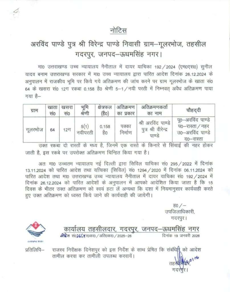 विधायक पांडेय की कुछ दिनों से मुश्किलें बढ़ती ही जा रही हैं। कभी उन पर लोगों की जमीन कब्जाने का आरोप लग रहा तो कभी भू माफियाओं को संरक्षण देने का आरोप लग रहा है। अब गदरपुर तहसील प्रशासन ने गूलरभोज स्थित उनके आवास में पहुंच कर उनके बेटे अतुल पांडेय को नोटिस थमाया है। इस नोटिस में नैनीताल हाईकोर्ट में दायर याचिका 192/2024 (एमएस) सुनील यादव बनाम उत्तराखंड सरकार का हवाला दिया गया है।