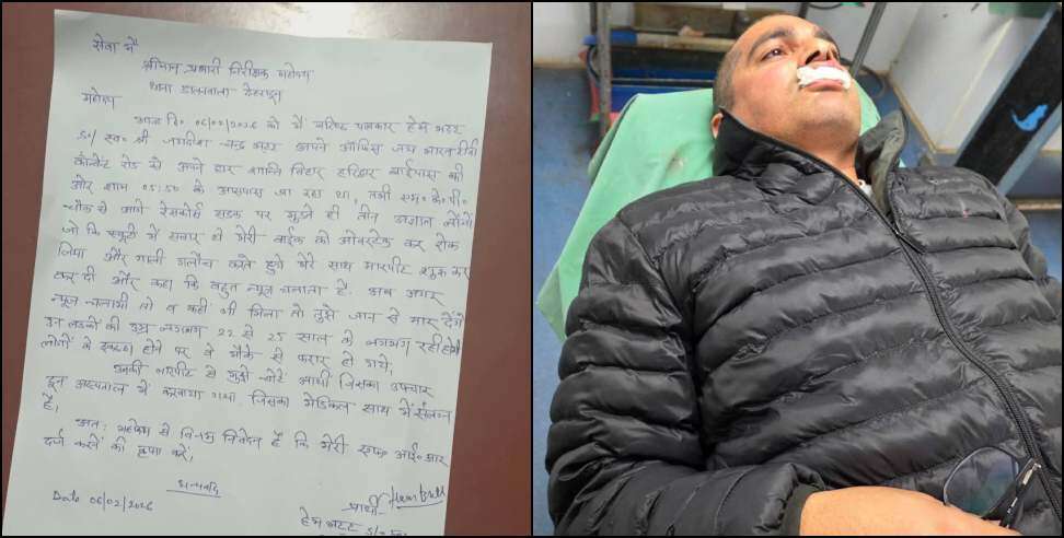 जानकारी के अनुसार पीड़ित वरिष्ठ पत्रकार हेम भट्ट, निवासी शांति विहार, हरिद्वार बाईपास रोड ने कोतवाली डालनवाला में शिकायत दर्ज कराई है। उन्होंने बताया कि शुक्रवार शाम करीब 6 बजे वह अपने कार्यालय से घर जा रहे थे। इसी दौरान एमकेपी चौक से आगे रेसकोर्स रोड पर स्कूटी सवार तीन युवकों ने उनकी मोटरसाइकिल को ओवरटेक कर रोका और अभद्र भाषा का प्रयोग करते हुए उनके साथ मारपीट की।