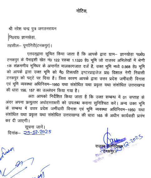प्रशासन ने नरेश चन्द्र पुत्र जगत नरायन निवासी ग्राम ज्ञानखेड़ा, तहसील पूर्णागिरी (टनकपुर) को भूमि कानून उल्लंघन के मामले में कारण बताओ नोटिस जारी किया है। जिसमें कहा गया है कि ग्राम ज्ञानखेड़ा, परगना टनकपुर स्थित 1.1320 हेक्टेयर भूमि में से 0.568 हेक्टेयर भूमि को संबंधित व्यक्ति द्वारा अन्य को पट्टे पर दिया गया, जो उत्तर प्रदेश जमींदारी विनाश एवं भूमि व्यवस्था अधिनियम, 1950 (यथा संशोधित, उत्तराखण्ड में प्रवृत्त) की धारा 156 एवं 157 का उल्लंघन है। संबंधित व्यक्ति को एक सप्ताह के भीतर अपना स्पष्टीकरण प्रस्तुत करने के निर्देश दिए गए हैं। निर्धारित अवधि में संतोषजनक उत्तर प्राप्त न होने पर अधिनियम की धारा 165 के अंतर्गत अग्रिम विधिक कार्यवाही की जाएगी।