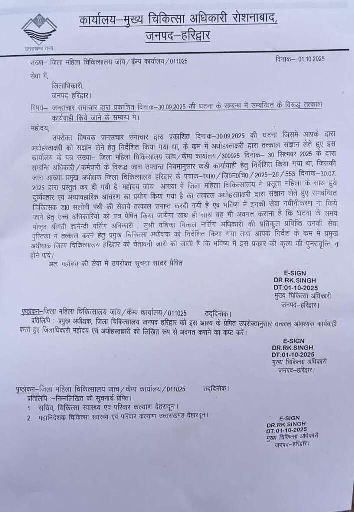 वहीं आयोग के जांच निर्देश के कुछ ही घंटों बाद स्वास्थ्य विभाग ने कार्रवाई करते हुए महिला चिकित्साधिकारी डॉ. सलोनी पंथी की सेवाएं तत्काल समाप्त कर दी हैं। साथ ही लापरवाह नर्सिंग स्टाफ पर भी सख्त एक्शन लिया गया है। जांच अधिकारी सीएमएस रणवीर सिंह ने साफ कहा है कि अमानवीय घटनाओं को किसी भी कीमत पर बर्दाश्त नहीं किया जाएगा।