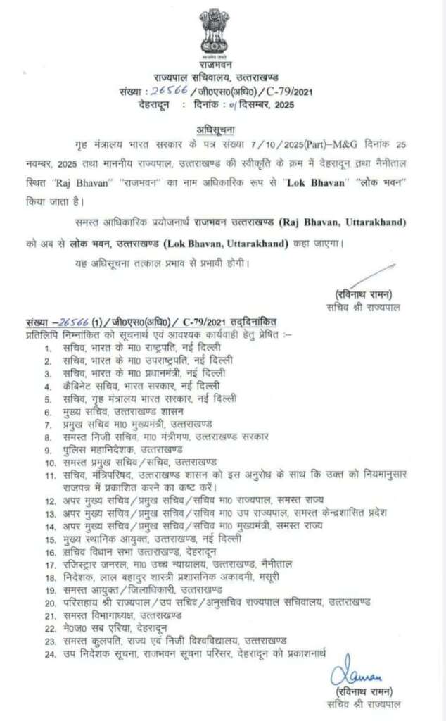 देहरादूनं उत्तराखंड ‘राजभवन’ का नाम बदलकर अब ‘लोक भवन’ कर दिया गया हैं जिसके तहत देहरादून और नैनीताल में मौजूद ‘राजभवन’ को अब ‘लोक भवन’ के नाम से जाना जाएगां 25 नवंबर 2025 को जारी गृह मंत्रालय भारत सरकार के पत्र संख्या के तहत और उत्तराखंड के राज्यपाल लेफ्टिनेंट जनरल (रि) गुरमीत सिंह की स्वीकृति के बाद देहरादून और नैनीताल स्थित राजभवन (Raj Bhavan) का नाम आधिकारिक रूप से लोक भवन (Lok Bhavan) कर दिया गया है। अब राजभवन उत्तराखंड (Raj Bhavan Uttarakhand) को अब से लोकभवन उत्तराखंड (Lok Bhavan Uttarakhand) कहा जाएगा। राज्यपाल सचिव रविनाथ रमन की ओर से अधिसूचना जारी की गई है।