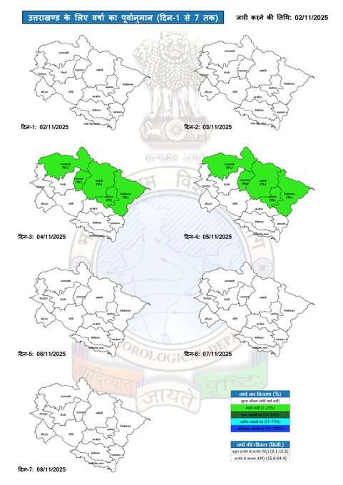 इन जिलों में बरसेंगे बादल: 4 नवंबर को गढ़वाल मंडल के सीमांत जिलों उत्तरकाशी, चमोली और रुद्रप्रयाग में बारिश होगी। हालांकि ये बारिश कहीं-कहीं और बहुत हल्की से हल्की होगी। इस दौरान बादल गरजेंगे तो बिजली भी चमकेगी। इसी तरह कुमाऊं मंडल के दो जिलों बागेश्वर और सीमांत पिथौरागढ़ में भी बारिश होगी। बाकी 8 जिलों में मौसम शुष्क रहेगा। मौसम विभाग के अनुसार वेदर का यही पैटर्न 5 नवंबर को भी रहेगा। दो दिन की बारिश के बाद 6 से 8 नवंबर तक पूरे राज्य में मौसम शुष्क रहने का अनुमान लगाया गया है।