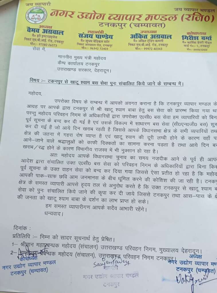 टनकपुर : खाटू श्याम बस सेवा पुन: संचालित किए जाने की मांग, व्यापार मंडल ने सीएम को ज्ञापन भेजा