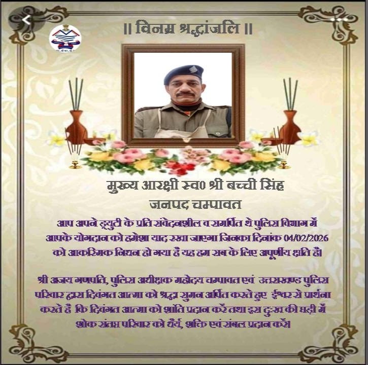 चम्पावत। जनपद चम्पावत में नियुक्त मुख्य आरक्षी बच्ची सिंह उम्र 50 वर्ष, जिनका मूल निवास ग्राम विरखन पो0 प्यूड़ा थाना मुक्तेश्वर जनपद नैनीताल था जो मुख्य आरक्षी पदोन्नति प्रशिक्षण हेतु 31 वीं वाहिनी पीएसी रुद्रपुर में रवाना हुए थे जो 01 दिवस का अवकाश प्रशिक्षण संस्थान से घर गये थे, जिनका दिनांक 04/02/2026 को रात्रि करीब 09.30 बजे घर पर आकस्मिक निधन हो गया है। जिससे समस्त चम्पावत पुलिस परिवार में शोक व्याप्त है।