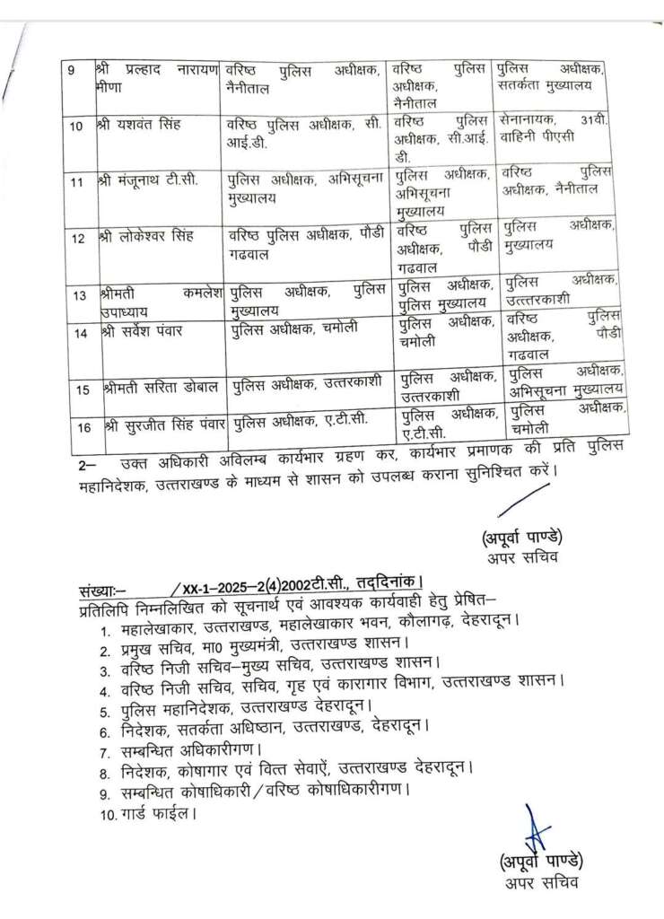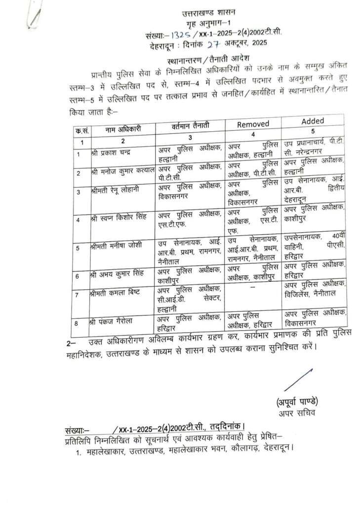 उत्तराखंड : 16 आईपीएस और आठ पीपीएस अधिकारियों के तबादले, चार जिलों के कप्तान भी बदले