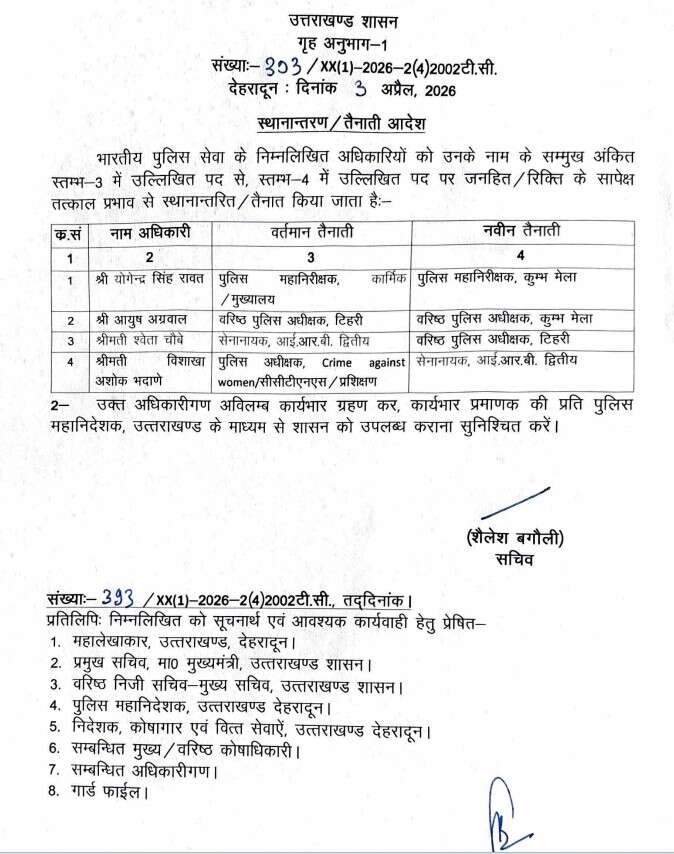 देहरादून। उत्तराखंड शासन ने प्रशासनिक व्यवस्था को और अधिक मजबूत बनाने के लिए भारतीय पुलिस सेवा (IPS) अधिकारियों के तबादले कर दिए हैं। 3 अप्रैल 2026 को जारी आदेश में 4 आईपीएस अधिकारियों की जिम्मेदारियों में बदलाव किया गया है। आगामी कुंभ मेले को ध्यान में रखते हुए इन तबादलों को बेहद महत्वपूर्ण माना जा रहा है, जहां कानून-व्यवस्था और सुरक्षा व्यवस्था को प्राथमिकता दी गई है।