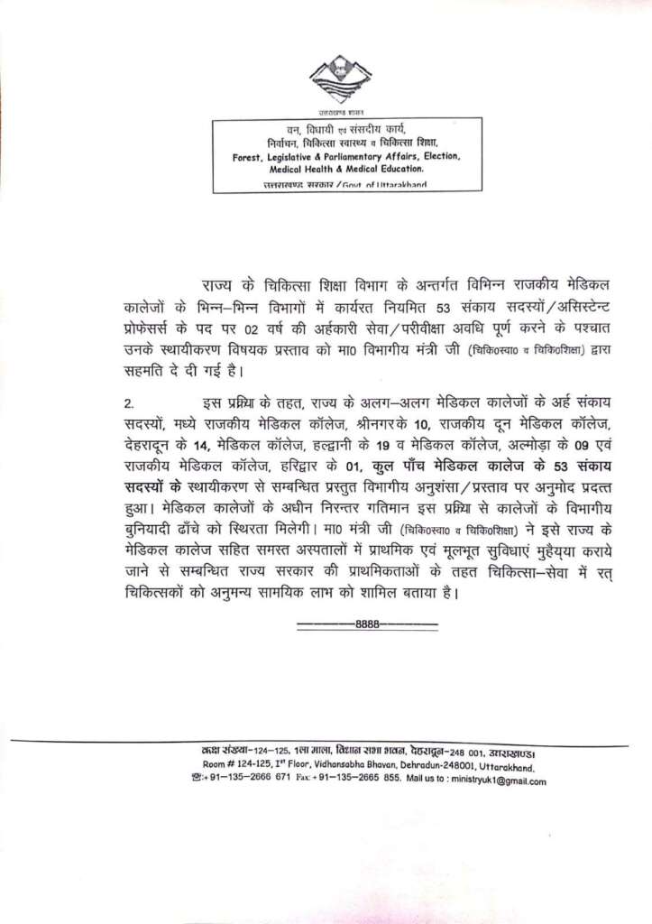 उत्तराखंड: 53 असिस्टेंट प्रोफेसरों की सेवाएं स्थायी, चिकित्सा शिक्षा मंत्री ने दी मंजूरी