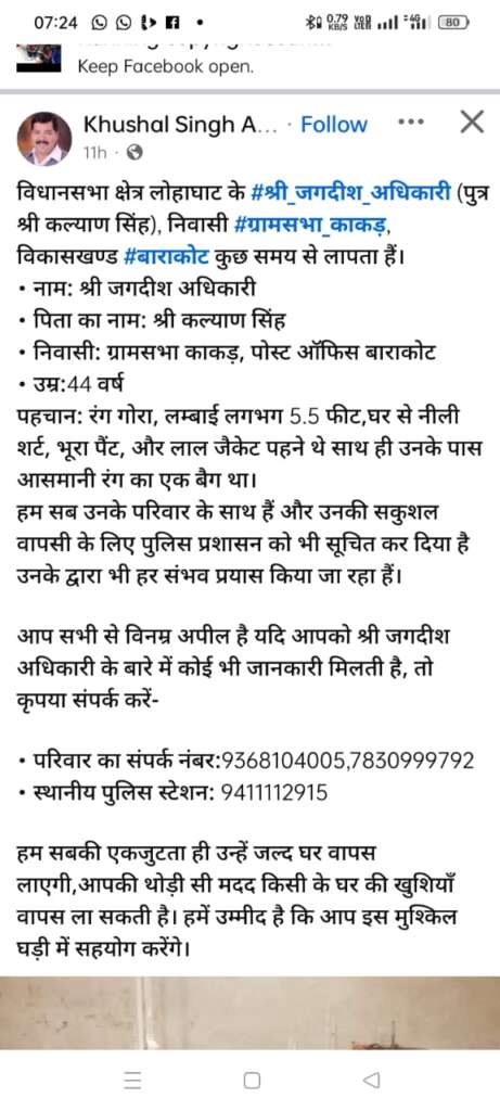 युवक की पत्नी रेनू अधिकारी ने लोहाघाट थाने में दी तहरीर में कहा कि उनके पति जगदीश सिंह अधिकारी (42) चार नवंबर को काकड़ से गुजरात के लिए निकले थे। बरेली पहुंचने के बाद उनसे बात हुई। इसमें उन्होंने बताया कि ट्रेन छूटने के कारण अब दूसरे दिन गुजरात के लिए रवाना होंगे। दूसरे दिन उनसे बात करने का प्रयास किया या तो उनका फोन स्विच ऑफ आया। उसने गुजरात फोन किया, लेकिन वहां भी उनके पति के बारे में पता नहीं चल पा रहा है। पीड़िता ने पुलिस से पति की खोजबीन की मांग उठाई। एसओ अशोक कुमार ने बताया कि लापता युवक की खोजबीन की जा रही है। वहीं सोशल मीडिया के माध्यम से भी युवक का पता लगाने की कोशिश की जा रही है। विधायक खुशाल सिंह अधिकारी समेत तमाम लोगों ने जगदीश की फोटो शेयर कर उसका पता लगने पर जानकारी देने की अपील की है।